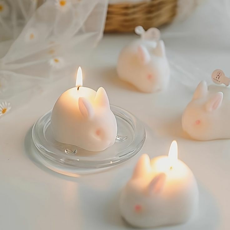 A charming vanilla scented bunny-shaped candle with delicate features, perfect for adding a touch of whimsy to any space. Its soft pastel colors and gentle glow create a cozy, inviting atmosphere.