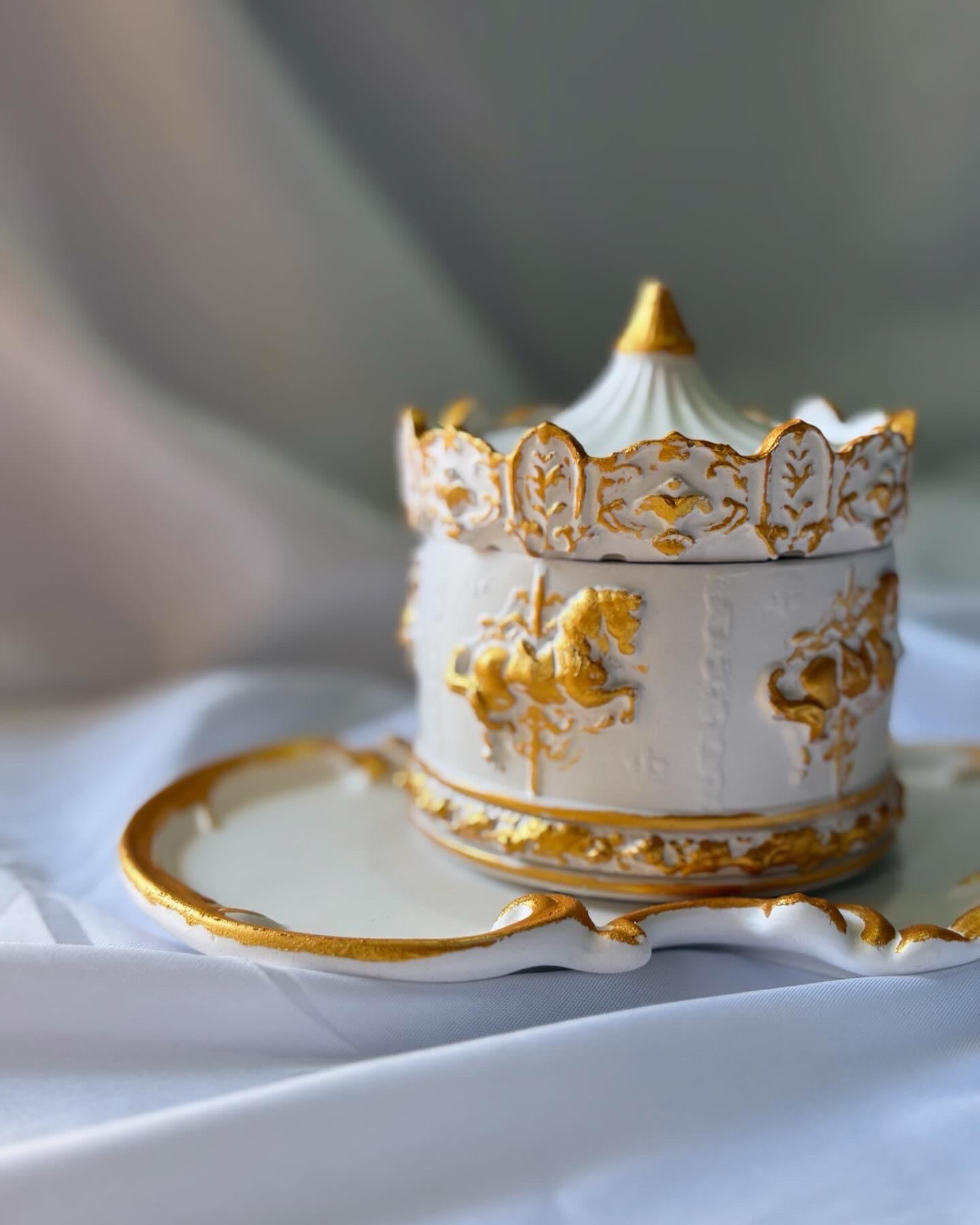 This charming carousel trinket decor is a whimsical addition to any space, featuring intricate detailing and soft, pastel colors that evoke a sense of nostalgia and joy. Perfect for adding a touch of playful elegance, it’s complemented by a beautifully crafted decorative tray set, designed to hold your favorite keepsakes or accessories. The tray's polished surface and delicate design enhance the carousel's enchanting appeal, making this duo an ideal gift or centerpiece for a cozy, feminine touch in any room. Whether displayed on a vanity, tabletop, or shelf, it’s sure to bring a touch of magic and charm to your home decor.