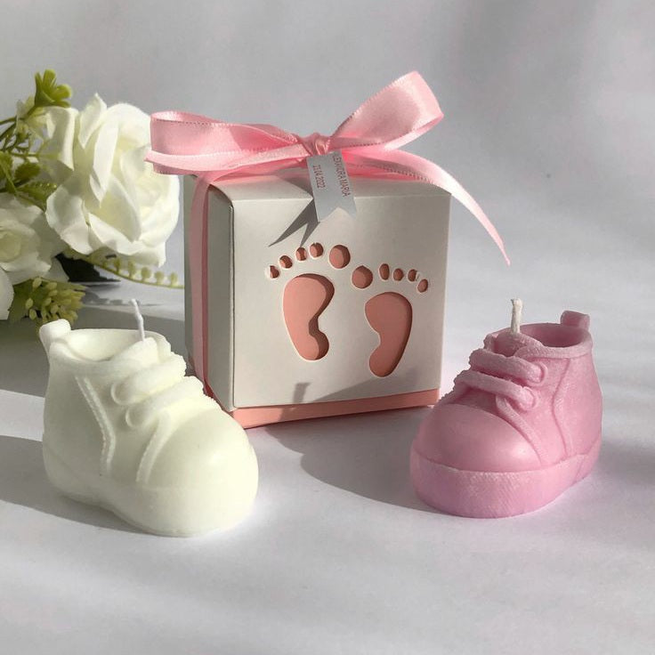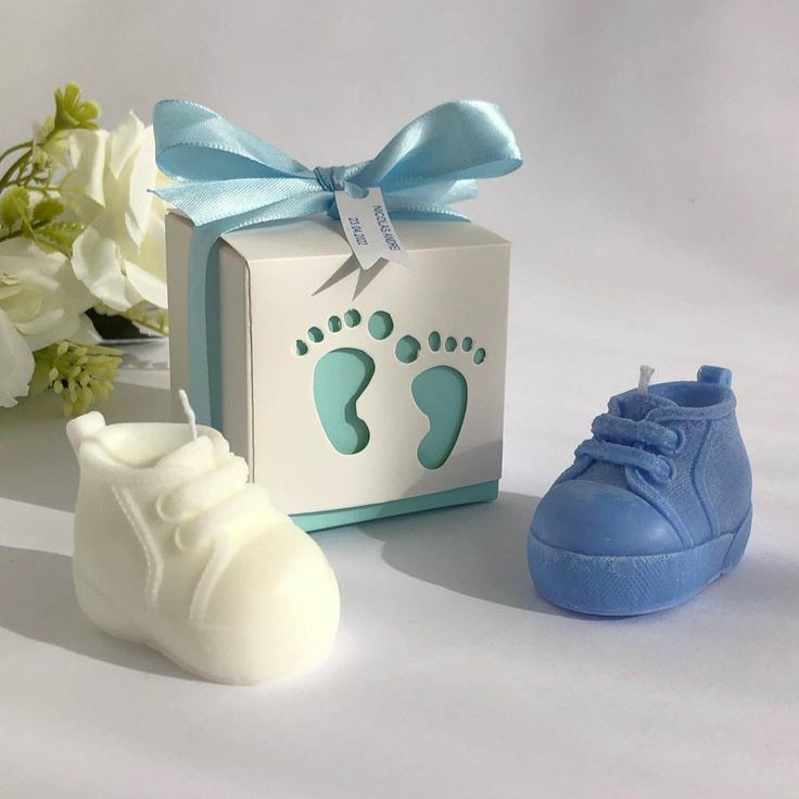 Meticulously crafted to resemble miniature baby shoes, our Little Luxe Steps candle set features two detailed wax sculptures that serve as charming decorative pieces. Each candle maintains perfect proportions while providing a clean, even burn. Ideal for baby showers, christenings, or nursery décor, these artisanal candles combine functionality with sentimental appeal. Baby shoe candle set of 2 with gift box
