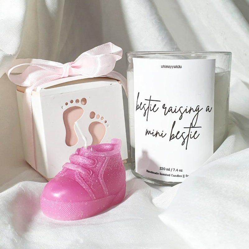 Elevate your home ambiance with our "Little Steps, Soft Scents" duo. This sophisticated set pairs a meticulously crafted baby shoe candle with a premium glass jar candle featuring a customizable label. Both candles deliver consistent fragrance diffusion while serving as distinctive decorative elements for any space. Perfect for commemorating special milestones or creating a personalized gifting experience.